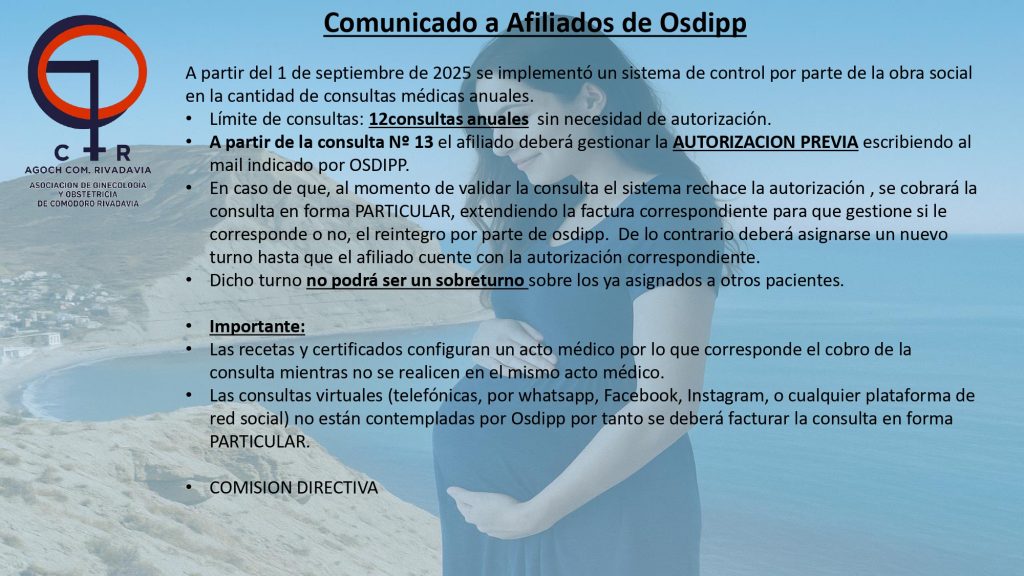 El Colegio Médico del Sur del Chubut informa que, a partir del 1 de septiembre de 2025, la Obra Social OSDIPP implementó un nuevo sistema de control sobre la cantidad de consultas médicas anuales autorizadas a sus afiliados.